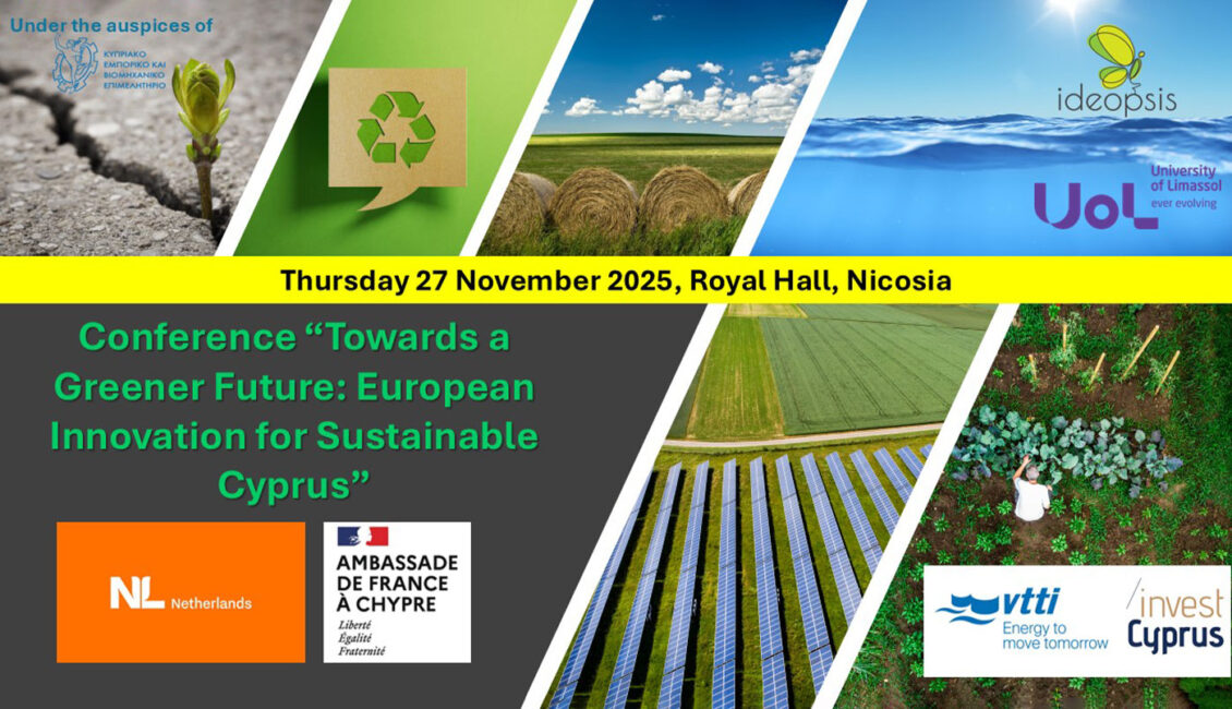 The Conference “Towards a Greener Future: European Innovation for Sustainable Cyprus” will take place on 27 November 2025 at the Royal Hall, Nicosia. The event is supported by the Embassies of France and the Kingdom of the Netherlands in Cyprus, in partnership with the University of Limassol (UoL), and organized by ideopsis Ltd.